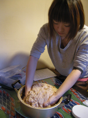 2011/02/28 Category : ワークショップ 『味噌作りワークショップ』レポート! 2月13日に行われた、味噌作りワークショップのお話。前々日11日の雪、そして翌日14日の大雪に挟まれたこの日は、午後の日差しがのんびりと気持ちの良い晴天。そんな中、ワタクシyumiが恐れ多くも講師をさせて頂いた『味噌作り』今回の参加者は3名の女子。とりあえず参加者のみなさんで自己紹介。ソファーに座っていたお二人は、某大手外資系コーヒーショップのスタッフ、マコちゃん&ガッキー。そして手前のイスに座っていたのは、ボサノバ&ジャズシンガーの諸星裕美さん。http://manystars.exblog.jp/自己紹介でお互いのPRに、「私、コーヒー好きでそのお店良く行きますよ。」「私、ボサノバ好きなんです!」と、早速意気投合した今回のメンバー達。味噌作りの行程を説明する時以外は、手を動かしながら終始おしゃべりタイム。まるで学生時代の「調理実習」のような楽しい雰囲気に♪すり鉢で大豆を潰し、大きな鍋へと集めていきます。。。その後大豆の上に塩、麹をのせ、大豆の煮汁をかけて…一気に混ぜます!!参加者全員で交代に混ぜまぜ。手を入れた瞬間に、「なんだか…未知の感触…!!」「気持ちいいかも♪」と、感想も様々。実は私はこの行程が一番好き♪乾燥麹が水を得た魚のように、プルプルと踊るような感覚。そして大豆のねっとりとした感じと、塩のザラザラ感。これを手の中で感じた時に「味噌作ってるぞ〜!」と実感するんです。同じ時間を共有したみんなで混ぜたお味噌は、きっと美味しくなるハズです!こうして完成し、後は熟成を待つだけとなった手作り味噌。最近流行りの『女子会』も、時にはこんな風に手を動かしながらおしゃべりを楽しむスタイルもアリですね♪ご参加頂いたみなさま、ありがとうございました!ちなみに、実はワークショップの後に…『もうお味噌教室はやらないんですか?』というお問い合わせを頂いています。一応『冬の寒仕込み』がテーマの味噌作りでしたが、2名様以上のグループで平日の夜でしたら日程を検討しながらご予約を受けようと思っています。その際は『春仕込み』になり前回とは若干説明が変更されますのでご了承下さい。味噌作りお問い合わせは 04-2963-3377まで。 PR Comment0 Comment Comment Form お名前name タイトルtitle メールアドレスmail address URLurl コメントcomment パスワードpassword
