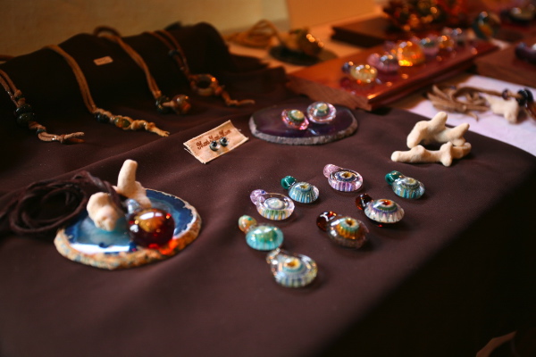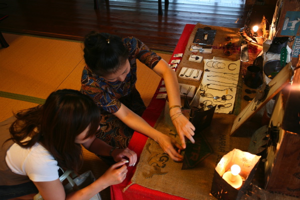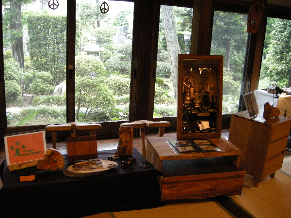 2008/07/28 Category : 作品展レポート TAM TAM CRAFT EXHIBITION 7/26(土)7/27(日)の2日間,亀有のお寺「慶圓寺」さんで開催されたグループ展が無事終了しました。来場者数は2日間で100人強!ご来場いただいたみなさま,ありがとうございました。真夏日となったその日,庭先にひっそりと咲き誇る蓮の花。本堂では阿弥陀様と観音様が静かに微笑む中,さあ,「アートセッション」の始まりです。 【TOUNKY WOOD WORKS】Take 東京都立品川技術専門校(木工科)卒業後,家具職人として勤務。某海外高級ブランドのディスプレイ等を手がける傍ら,独自のブランドTOUNKY WOOD WORKS設立。「気のみ木のまま」をコンセプトに天然木を身近に感じる作品を提案。 【ManiMani Moon】yukiボロシリケイトガラス界では男性作家が多い中,数少ない女性作家の1人。spiral artsにて学び,その後独立。埼玉県秩父市に独自の工房を持つ。女の子の欲しいガラスを形にした作品が魅力。 【charan】山田亜衣銅や真鍮を用いた雑貨&アクセサリーは懐かしさと新しさの2つの面を持つ優しい風合い。作家歴8年。現在は毎年行われる東京・恵比寿の個展を軸に地方出店にも足を運び,多くのファンの支持を得る。 【関 太一郎】不自由ない生活が約束されていた中あっさり脱サラ。陶芸の道へ。本場・愛知県瀬戸市に渡り陶芸学校にて2年間学ぶ。現在は都内の陶芸教室で講師を勤める。ユニセックスな風合いが老若男女を問わず定評あり。 【pavan-ti 】大村麻衣子文化服装学院卒業。 cheyennerich(シャイアンリッチ)デザイナーを経て,自身のブランドpavan-ti(パバンティー)を設立,始動。旅で出会った生地や古着を使用したリメイク作品が中心。手間を惜しまず施した刺繍は一見の価値有り。そして1日2回,阿弥陀様の前で民族楽器の即興セッションLIVEも。お寺さんからお借りした木魚が山本智紀さんの手によって,ひと味違った楽曲に仕上がりました。【山本智紀】(画像中央)アフリカンドラムサークル「たむたむちんぱんじー」主宰。西アフリカで半年に渡る修行を経て現在は世田谷区・目黒区を中心にワークショップを開催。保育園〜小学校,障害者施設や老人ホーム等のライブ活動も行っている。山田亜衣さん作の動物パズルの前では,お客様も思わず笑顔に。作り手とゆっくりお話が出来るのも作品展の魅力の一つ。こんなに小さなお客様もいらしてくれました。会場内ではすっかり人気者,ゆうみちゃん(1歳)彼女の眼にはどんな風に映っているのかな?以上がTAM TAM CRAFT EXHIBITIONのレポートです。本当に素敵なグループ展でした。最後に,発表の場を快く与えて下さったご住職をはじめとする慶圓寺のみなさま。グループ展を影で支えてくれた,スタッフの金ちゃん。本当にありがとうございました。作家のみなさん,私達にとってみなさんとの繋がりが財産です。ありがとうございました。また一緒に開催しましょう。そして,この感謝の気持ちを込めたレポートを私達の輪を繋げて下さった,山本智紀さんに捧げます。素敵な出会いをありがとうございました。