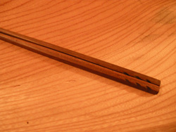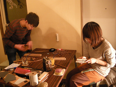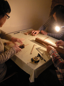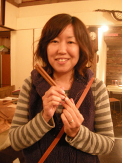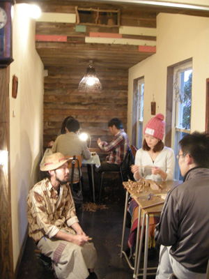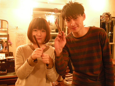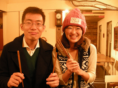 2011/01/25 Category : ワークショップ 第2回『マイ箸作りWS』レポート! 先日1月23日に行われた、『第2回マイ箸作りワークショップ』今回は4名の参加者と共に楽しい時間を過ごす事が出来ました♪前回同様、講師のtakeから「お箸に適した木材の選び方」やカンナの使い方など、説明の後に一斉にスタート!みなさん気合いはバッチリ!途中takeから「時間はたっぷりあるので焦らないで下さい!」と、声がかかる程の凄まじい熱気。それでもやっぱり長い時間の戦いになると感じた参加者の方々は、自分のペースを掴んで休憩したり、談笑したりと次第に和やかに…。ワークショップというのは人それぞれの捉え方があるとは思いますが、私の考えとしては…同じ日に、同じ場所で、同じ作業を取り組む人達が集まるという一つのミラクル。年齢や職業、住んでいる環境や普段の考え方を超えた一期一会の出会いを大切にして頂きたいと思っています。なので参加者同士で話をしたり、お互いの作品を見せ合いながら認め合っている光景を見るのが楽しみだったりします。カンナの扱いにも次第に慣れ、2本の木材を調節しながら一膳のお箸へ…。「あと2、3ミリ…」と、中心に対して余分な場所を見極め削っていきます。そしていよいよ仕上げのオリーブオイルを馴染ませ磨いて完成です!みなさん肩の力が抜け、大満足の表情に…!週末はジョンソンタウンによく出没しているコチラのカップル。大満足の出来に終了後はマイ箸でお食事をして下さいました!「自作のお箸で食べるものは格別!」らしいです★ 今回も参加者全員が「お箸完成!」となったワークショップ。ケガもなく無事に終え、一安心です!ご参加頂いたみなさま、お疲れさまでした!&ありがとうございました!!