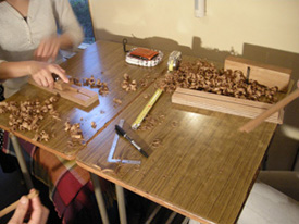 2010/12/29 Category : ワークショップ マイ箸作りWSレポート! またまた更新が遅くなってしまってごめんなさい…。11月14日(日)に行われた『マイ箸作りワークショップ』のレポートです。講師はもちろん当TOUNKY WOOD WORKS主宰のTakeによる、約1年半ぶりの木工体験教室です。申し訳ないことに、「5才の子供は参加出来ますか?」など、お母様方から沢山のお問い合わせを頂いたのですが、今回は小学校高学年以上の方を対象にさせて頂きました。というのも…お箸作りのワークショップは別名『ストイック・クラス』カンナで2本の角材を一膳のお箸に仕立てる、「削ってはまた削り」の作業が延々と…。大人の方でもだいたい3時間程かかる作業なんです。この日の参加者は5名。最初にTakeからお箸に適した木材の種類やカンナの使い方など、基本的な説明の後、一斉に作業の開始です。講師のTakeがアドバイスに回る時以外は店内は無言に包まれ、カンナの音が聞き取れる程の『無』の世界。。。そして開始から3時間、ただの四角い棒だった木材が大変身を遂げました! この完成度に講師のTakeからは「今回の参加者はレベルが高い」と絶賛の声が!それぞれ彫刻刀でデザインを施し、個性的な作品に仕上がっていました。参加者のみなさんもご自身の作品の出来にご満悦の表情♪ こちらの3人はご夫婦とそのお母様という素敵な組み合わせ。以前草木染め教室に参加し、今回用事で参加出来なかったお嬢さんからご紹介の、モノ作り大好きファミリー☆そしてこちらは前回の草木染め教室にも参加して頂いた彼女と、パートナーの彼。デートの一コマにモノ作りを選ぶナイスカップルです♪『無の時間』が『和やかな時間』に変わった瞬間でした。参加者のみなさま、お疲れさまでした!次回のマイ箸作りワークショップは1月23日(日)の予定です。作品を作りたい方、『無の心』になりたい方…ご参加お待ちしております!!