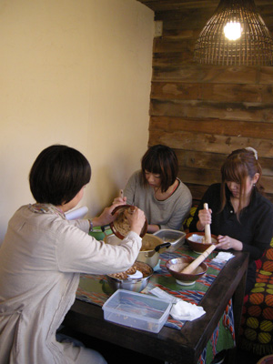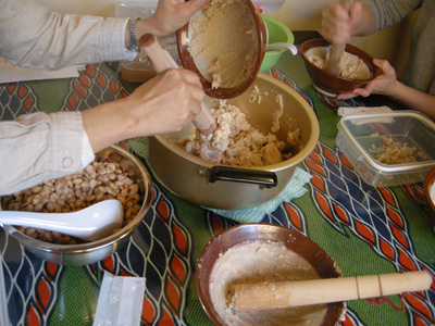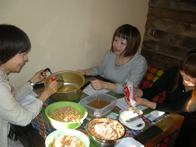 2011/02/28 Category : ワークショップ 『味噌作りワークショップ』レポート! 2月13日に行われた、味噌作りワークショップのお話。前々日11日の雪、そして翌日14日の大雪に挟まれたこの日は、午後の日差しがのんびりと気持ちの良い晴天。そんな中、ワタクシyumiが恐れ多くも講師をさせて頂いた『味噌作り』今回の参加者は3名の女子。とりあえず参加者のみなさんで自己紹介。ソファーに座っていたお二人は、某大手外資系コーヒーショップのスタッフ、マコちゃん&ガッキー。そして手前のイスに座っていたのは、ボサノバ&ジャズシンガーの諸星裕美さん。http://manystars.exblog.jp/自己紹介でお互いのPRに、「私、コーヒー好きでそのお店良く行きますよ。」「私、ボサノバ好きなんです!」と、早速意気投合した今回のメンバー達。味噌作りの行程を説明する時以外は、手を動かしながら終始おしゃべりタイム。まるで学生時代の「調理実習」のような楽しい雰囲気に♪すり鉢で大豆を潰し、大きな鍋へと集めていきます。。。その後大豆の上に塩、麹をのせ、大豆の煮汁をかけて…一気に混ぜます!!参加者全員で交代に混ぜまぜ。手を入れた瞬間に、「なんだか…未知の感触…!!」「気持ちいいかも♪」と、感想も様々。実は私はこの行程が一番好き♪乾燥麹が水を得た魚のように、プルプルと踊るような感覚。そして大豆のねっとりとした感じと、塩のザラザラ感。これを手の中で感じた時に「味噌作ってるぞ〜!」と実感するんです。同じ時間を共有したみんなで混ぜたお味噌は、きっと美味しくなるハズです!こうして完成し、後は熟成を待つだけとなった手作り味噌。最近流行りの『女子会』も、時にはこんな風に手を動かしながらおしゃべりを楽しむスタイルもアリですね♪ご参加頂いたみなさま、ありがとうございました!ちなみに、実はワークショップの後に…『もうお味噌教室はやらないんですか?』というお問い合わせを頂いています。一応『冬の寒仕込み』がテーマの味噌作りでしたが、2名様以上のグループで平日の夜でしたら日程を検討しながらご予約を受けようと思っています。その際は『春仕込み』になり前回とは若干説明が変更されますのでご了承下さい。味噌作りお問い合わせは 04-2963-3377まで。