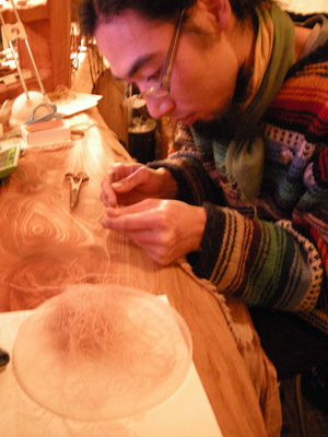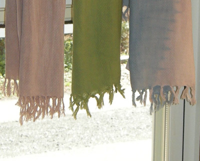 2010/03/10 Category : ショップ情報 伝える事が大事。 これ、なんだかわかりますか?(刺身のツマではありません!笑)それではもう少し遠くから…これは現在開催中の草木染めの作者の一コマ。とある事情で少しの時間お店番を彼らに任せ、戻ってきた私はとっさに一言。「…何してるの??」『あぁ、これね、「フリンジ」にしてる所。』ちなみにフリンジとは↓この下のフサフサ↓の事です。思い起こせば、「赤ちゃんのオムツ素材」が特徴のお肌に優しいコットンストール。だけど…フリンジなんてあったかしら??と思っていた私。まさかこれも手作業だったなんて!!通常、布というのは縦糸と横糸の重なりあったもの。その横糸のみを一本一本慎重に抜いて残った縦糸を結んでいくという、考えただけで気の遠くなるような作業。こんな現場、アジアの「村観光ツアー」に行けば見られるのかも知れないけど、日本のアーティストも実はこうして人目につかない所で作品に愛情を注いでいるんですね。『自分達で摘みにいった染料を、焚き火で煮出して、染める。 染めたものは、よりクオリティを高めるため自分の手で加工する。』葉音色〜haoniro〜のお二人とこうして個展フェアを開催しながら一緒に時間を過ごしていると多くの事を学ばせてもらったり、なぜ葉音色〜haoniro〜の作品が、ご来店頂いたお客様に愛されるのかを肌で感じる事が出来ます。そして、そんな真面目な生産者のお二人を、微力ながら私がみなさまにお伝えしていく事が大切だと改めて感じた時でもあります。 PR Comment0 Comment Comment Form お名前name タイトルtitle メールアドレスmail address URLurl コメントcomment パスワードpassword