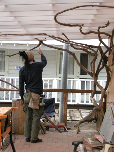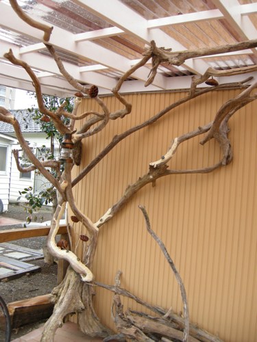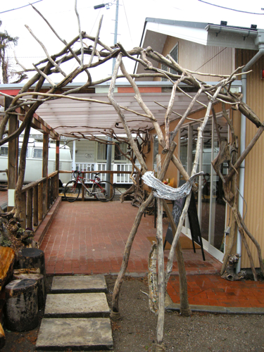 2010/02/24 Category : ショップ情報 クローズアップ『柏木弘明 流木アートの世界』 TOUNKY WOOD WORKSのテラス側入り口にある、流木のアーチ。そしてテラスの中にある流木の木のオブジェ。この流木アートは、草木染めユニット『葉音色〜haoniro~』で活動中の柏木弘明さんの作品です。毎年行われる埼玉県秩父市の「てのひらまつり」や東京都内・明治公園の「BE-IN」等で期間限定のオブジェを制作してします。(常設用を手がけるのは今回が2度目との事。)会場でキャンドルが無数に灯されたこのオブジェを見て一目惚れした私達は、「お店やる時はこのオブジェ置きたいよねえ。。。」と、その時は構想もまだ夢の中…。本格的にジョンソンタウンでの出店計画が持ち上がった頃、出店で訪れた栃木県の益子で出会った柏木さん。出店仲間として仲良くなり、話も花咲いていた頃、Takeが興奮した様子で私の元へ。「あの流木のオブジェ、ヒロさんが創ってるんだって!」偶然ではなく、何かに導かれたような出会い。普段は木の仕事なら自分でこなすTakeも、流木アートは彼にお願いしたいと正式に施工の依頼をさせて頂きました。施工期間は5日間。大量の流木に一本一本、ていねいに防腐材の処理を施します。そして乾いた材を頭の中の立体のイメージ、実際の流木の耐久性と照らし合わせて慎重に組み上げていきます。施工時の実際の様子こうして出来上がったテラスの流木アートは、お客様だけでなく、ジョンソンタウン内の職人さん達の間でも話題になりました。寸法や、細かい設計図のない状態から立体を作り上げる感性と技術は、まさにアートの世界。この作品のおかげで「思わず近づきたくなるお店」が実現しました。そんな彼の本業である『草木染め』の個展を兼ねたフェア、「はおにろまるくと」が3月2日(火)〜3月16日(火)の期間TOUNKY WOOD WORKSで開催されます。在店日は近日Newsページに掲載しますので、草木染めのオーダーメイドはもちろん、流木アート施工のご相談等、お気軽にお問い合わせくださいませ。