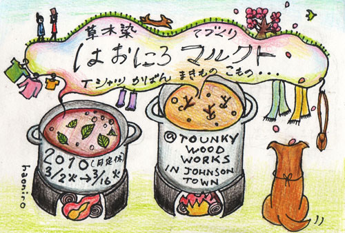 2010/02/26 Category : ショップ情報 明日から3日間休業します! オープンの日から無休で営業していたTOUNKY WOOD WORKSですが、明日から3日間休業致します!!え?3日間も??と、思われる方もいらっしゃると思いますが…明日27日(土)、28日(日)は東京は浅草でのイベント出店。そして3月1日(月)は商品入れ替えの為のお休み。水面下ではまだまだ頑張っております!!色々な方々から「お店始めたら出店はしないの?」と良く聞かれますが、TOUNKY WOOD WORKSの方針としては、出来る限り出店にも参加したいと思っています。商い=飽きない!この気持ちをモットーに進めていくには、私達自身がお店のPRの為に足を運び、『もの作り』の第一線を見て聞いて触れて、吸収していくのは大切な事。例えば美容師さんが最新のパーマやカラーの技術を得る為に研修に参加するのと同じで、私達が出店で様々なアーティストやお客様と出会っていく事で、『進化し続けるTOUNKY WOOD WORKS』を保っていけるのではないかと思っています。ジョンソンタウンのこの場所で、訪れた人全てに「新しい発見」と「感動」を与える事の出来る、そんなお店を目指して…。なので、せっかくご来店頂いて「休業」という場面にならぬよう、HP上ではマメにアナウンスしているつもりでおりますが、万が一休業日にご来店頂いたお客様、誠に申し訳ございません!!が…ご理解頂けますようお願い申し上げます。そして、3月からは定休日を月曜日(祝日の場合は火曜日に振替)と定め、最初のお休みである1日は、フェア開催準備の為の商品入れ替えとさせて頂きます!画像は2日(火)より始まる「はおにろマルクト」の予告画像。お店の中はガラリと変わり春一色に♪TOUNKY WOOD WORKSに既にご来店頂いた方にも、「新しい発見」をお約束致します!それではきっと、2月最後の記事になるであろう本日のブログ。3月、春が訪れるこの場所でみなさまをお待ちしております。